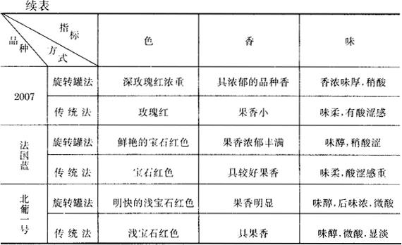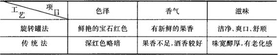 (四)旋转罐法与传统法发酵质量对比 1.发酵结束时质量对比 采用同一品种原料,同时破碎,分别发酵,传统法按常规的方法在水泥池中发酵5~6天,发酵终了出池测定成分。旋转罐法在罐内定压、定温旋转浸提发酵24~36h,分离汁液入露天发酵罐继续发酵。两种方法生产的酒,其理化指标与感官品评分别见表3-3-25、3-3-26、3-3-27。 表3-3-25 旋转罐法与传统法发酵结束时质量对比