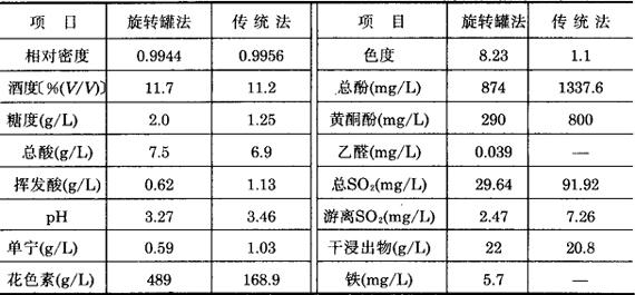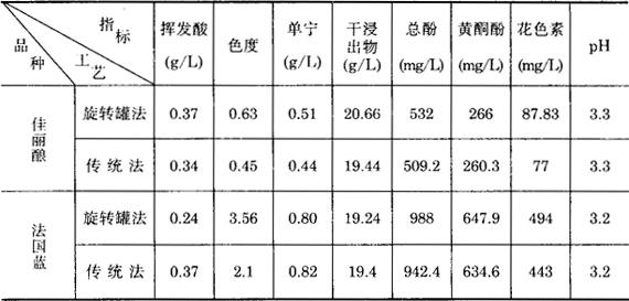 两种工艺生产的红葡萄酒成品酒理化指标见表3-3-33,两种工艺成品酒指标变化见表3-3-34。 表3-3-33 两种工艺生产的葡萄酒理化指标对比