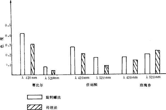 由表3-3-31可知,旋转罐法生产的红葡萄酒比传统法生产的红葡萄酒色度提高47%以上。 两种方法生产的原酒贮存8个月后色度对比见图3-3-11。