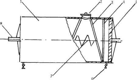 图3-3-13 Seitz旋转罐体 1-罐体 2-进料排渣口、人孔 3-螺旋板 4-过滤网 5-封头 6-出汁阀门 7-冷却蛇管 8-罐体短轴 罐体采用卧式可转动的罐,外形尺寸为Φ1800×4454mm,为节省材料,罐体是由碳钢内衬厚度2mm的不锈钢制成,材质为1铬18镍9钛(1Cr18Ni9Ti)。整个罐体两端旋转轴由对开式滑动轴承座落在支架上。两端封头采用平封头加筋板的结构。在罐体内靠近两端部位,各设置有过滤板一块,使葡萄汁和皮渣分开。葡萄汁由筛板右侧的球阀门排出,皮、渣通过罐体旋转时,利用罐体内的两条螺旋导板由入料口排出。运行证明,经过5~6转就可将罐内皮、渣全部排出罐外。排渣口兼作人孔,便于罐内维修。 为控制罐内发酵温度,罐体上装有温度表,罐内设有蛇形冷却管,当温度超过规定条件时可冷却,若罐内温度下降需要升高时,可通过蛇管升温。 为控制罐内压力达到安全操作,罐体上装有压力表、安全阀,超过压力时,可自动排泄降压。 3.传动部分 根据工艺要求,旋转方向是正、反两个方向,即正转5min,停25min,反转5min。旋转的方向、时间、停转时间可自行调节。罐体旋转传动方式是由行星式摆线针轮减速器,通过对开式齿轮,使罐体转动。 4.支架 支架的主要作用是将罐体和传动部件支承起来,并为罐体与螺旋输送器连接提供空间。支架材质为碳钢。 5.螺旋输送器 在罐体底部与排渣口相对设有一台螺旋输送器,目的是将排出的皮渣输送到压榨机上,进行压榨。搅龙直径Φ400mm,长2.5m,旋转速度16.7r/min。 (二)Vaslin型旋转罐设备 1.设备的技术参数 Vaslin型旋转罐设备参数见表3-3-38。 表3-3-38Vaslin型旋转罐设备参数