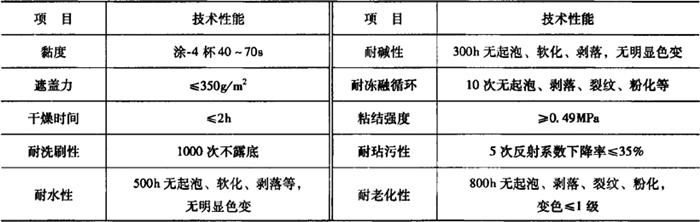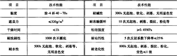 (二)硅溶胶外墙涂料 硅溶胶外墙涂料是以胶体二氧化硅为主要成膜物质,有机高分子乳液为辅助成膜物质,加入适量的颜料、填料和助剂等,经搅拌、研磨、调制而成的水分散性涂料,它既保持无机涂料的硬度和快干性,又具有一定的柔性和较好的耐洗刷性,是近年来新开发的性能优良的外墙涂料。 硅溶胶外墙涂料是以水为分散剂,具有无毒无味的特点,施工性能好,遮盖力较强,膜层表面的耐污性好,与基层之间有较强的粘结力,涂膜的质感细腻、致密坚硬,耐酸碱腐蚀,有较好的装饰性。 硅溶胶外墙涂料是以硅溶胶为主要成膜物质,同时还添加聚醋酸乙烯乳液和苯乙烯-丙烯酸酯乳液等有机成膜物质,这样可使涂料兼有有机涂料和无机涂料的各自优点,使涂膜干燥速度加快,并具有一定的硬度、柔韧性、耐洗刷性能。颜料有金红石型钛白粉、铁系颜料等;填料有碳酸钙、滑石粉、石英粉、云母粉等;助剂有增稠剂、乳化剂、分散剂和消泡剂等。 硅溶胶无机外墙涂料的主要技术性能如表18-27所示。 表18-27 硅溶胶无机外墙涂料的主要技术性能