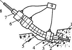 图6-41 变角张拉装置 1-凹口;2-锚垫板;3-锚具;4-液压顶压器;5-变角块;6-千斤顶;7-工具锚;8-预应力筋;9-油泵 无粘结预应力筋在张拉过程中,应随时测定其伸长值,其张拉伸长值的校核与有粘结预应力筋相同。对超长无粘结预应力筋,由于张拉初期的阻力大,初拉力以下的伸长值比常规推算伸长值要小,应通过试验进行修正。 (三)锚头端部的处理 锚头端部的处理非常重要,它不仅关系到预应力混凝土构件的使用年限,而且关系到建立的预应力是否可靠。无粘结预应力筋张拉完毕后,应及时对锚固区进行保护。锚固区必须有严格的密封防护措施,严格防止水汽进入锈蚀预应力筋。无粘结预应力筋锚固后的外露长度应不小于30mm,多余部分宜用手提砂轮将其切割。在锚具与承压板表面涂以防水涂料。为了使无粘结预应力筋端头全封闭,在锚具端头涂防腐润滑油脂后,罩上封端塑料盖帽。 锚头端部处理主要有凸出式和凹入式两种。对于凸出式锚头端部处理方式,目前常用两种方法:第一种方法是在孔道中注入油脂并加以封闭,如图6-42所示;另一种方法是在两端留设的孔道内注入环氧树脂水泥砂浆,其抗压强度不低于35MPa,在灌浆的同时将锚头封闭,如图6-43所示。