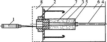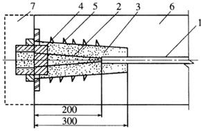 图6-43 锚头端部处理方法之二 1-无粘结预应力束;2-无涂层的端部钢丝;3-环氧树脂水泥砂浆;4-锚具;5-端部加固螺旋钢筋;6-构件;7-混凝土封闭