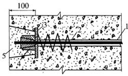 图6-44 张拉端凹入式构造 1-无粘结预应力筋;2-螺旋筋;3-承压钢板;4-夹片锚具;5-砂浆 无粘结预应力筋的固定端,也可利用镦头锚板或挤压锚具采取内埋式做法,如图6-45所示。