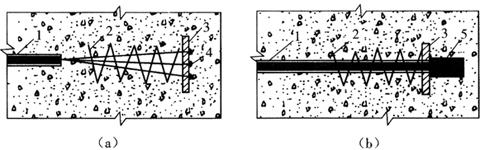 图6-45 无粘结预应力筋固定端内埋式构造 (a)钢丝束镦头锚板;(b)钢绞线挤压锚具 1-无粘结预应力筋;2-螺旋筋;3-承压钢板;4-冷镦头;5-挤压锚具 |