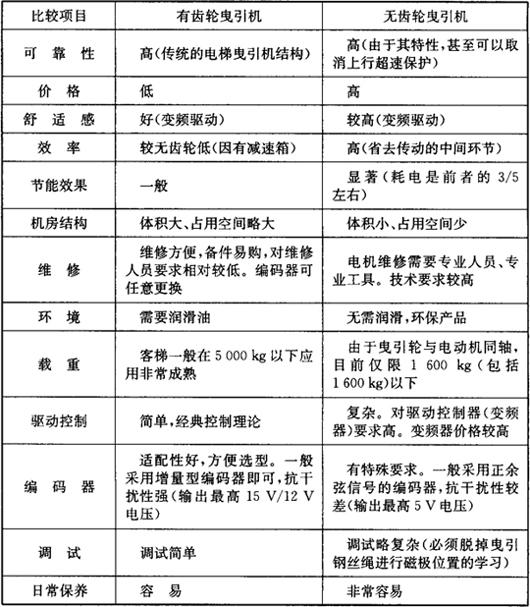 表14.1-1 有齿轮曳引机与无齿轮曳引机的综合比较