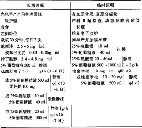 说明:(1)硫酸沙丁胺醇5mg加5%葡萄糖500Inl中静脉滴注,开始时滴速为10滴/min,然后可逐渐增大,最大<50滴/min,控制后改口服,持续3~6天,极量12mg/d,心功能不全、高血压、甲亢、糖尿病慎用,禁止与糖皮质激素联合应用;或用柔托扒(Yutopar)50mg加入5%葡萄糖液250ml中滴注,开始时4滴/min,每10分钟增加4滴,至宫缩消失或产妇心率达140次/min,持续24~48小时,停止点滴前1小时中服缓释胶囊40mg,每8小时1次,连续3~4天,如再发宫缩重复上述方式给药。 (2)地塞米松10mg羊膜腔内注射,尽可能使分娩推迟至48小时后。 |