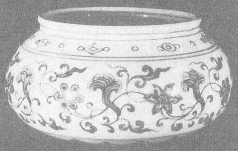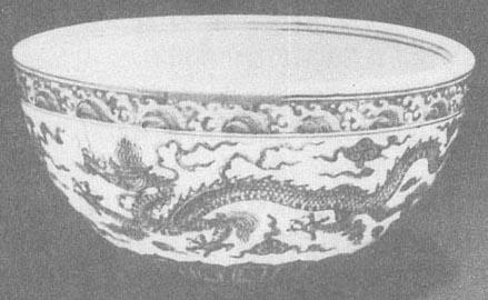 41.青花缠枝花卉压手杯 明·永乐 永乐青花瓷纹饰非常纤细。常见纹饰有折枝花果、缠枝牡丹、缠枝莲花、缠枝四季花、缠枝牵牛花、菊瓣、花鸟、云龙、云凤、龙穿花(图57)、凤穿花、胡人形像的舞乐人等,边饰有海水波涛、卷草、莲瓣、蕉叶、如意云头、回纹、弦纹等等。