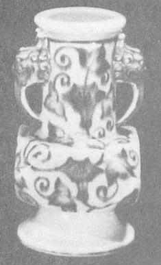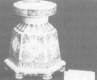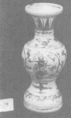 图82 正德时瓷器上的阿拉伯文款 正德时开始出现仿宣德瓷器,无论胎釉(釉中有细密的气泡)、青花颜色(浓艳,有的甚至有黑斑、晕散,但没有锡光及下凹的效果)、纹饰(如海水八怪、海马、海兽等,主题纹饰深,做为衬托的海水色浅)及造型等都像模像样,也署宣德款,但无论怎么刻意追求逼真,还是有正德本朝的风格。 正德时期的釉里红瓷不多,也没有什么创新,只见过一件三果杯,釉里红颜色浓淡不一,浓的地方鲜艳,淡的闪黄。也有三鱼碗、盘传世,这些是宣德、成化以来的传统品种。 (四)明晚期 1.嘉靖时期的青花瓷和釉里红瓷 嘉靖皇帝在位四十五年(1522~1567年),国力强盛,需用瓷器量很大,因此传世品很多。这一时期青花官窑小件瓷器的胎子坚致细密、胎轻体薄,大件瓷器坚致但较粗、胎体厚重;小件器的釉面肥润光亮,大器欠平整,釉色白中闪青或闪灰。嘉靖时期的青花瓷器主要用西域地区的钴料——“回青”及江西产“石子青”配合使用(1),描绘出色彩艳丽闪紫的纹饰。由于“回青”料含铁量低,所绘纹饰没有黑色斑点,又由于含锰量高,纹饰浓艳泛紫。“回青”与“石子青”的配比必须适当,否则“回青”多了,纹饰流散,而“石子青”多了,颜色灰黑不鲜亮。由于嘉靖皇帝迷信道教,崇尚炼丹,幻想成仙,因此嘉靖瓷器上常见松鹤、云鹤、仙鹿、八卦、灵芝、“卍”字,仙人乘槎等富于道教色彩的纹饰,除此之外还有鱼藻纹、三羊开泰、婴戏仕女、云龙火球、鸡冠唐草、花果花鸟、松竹梅三友、缠枝莲、缠枝牡丹、垂云、菊花、八仙、暗八仙(即八仙用的东西:扇子、鱼鼓、横笛、葫芦、阴阳板、宝剑、花篮、莲花或笊篱)、八宝、“福”“禄”“寿”、凤穿花、团龙、团凤、狮球麒麟、荷塘鸳鸯。这时的云纹还是“壬”字形;龙呈猪形嘴、比目眼(双眼在一侧,像比目鱼,因名),发毛前冲,爪子呈风车状;寿星的脑门很大很高,像冬瓜;小孩的后脑勺很大,爱穿长袍大褂。纹饰布局繁缛,没有层次。此时山水通景纹饰开始出现。 嘉靖时器型种类很多,盒有圆的、方的、倭角四方的、六楞或八楞的;葫芦瓶亦有圆的、方的、六方的、上圆下方的;瓶有梅瓶、蒜头瓶、锥把瓶、盘口瓶(图83)、蟠