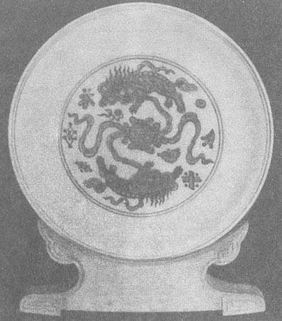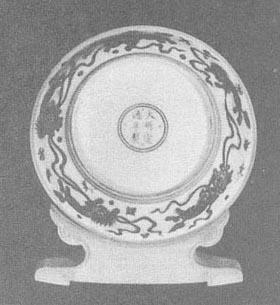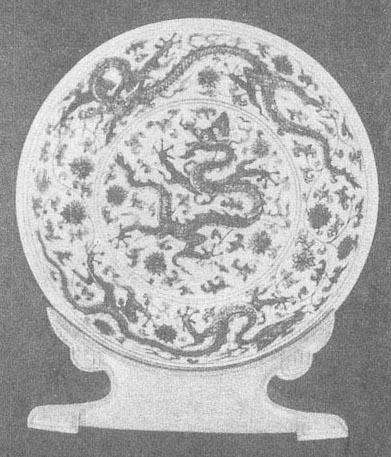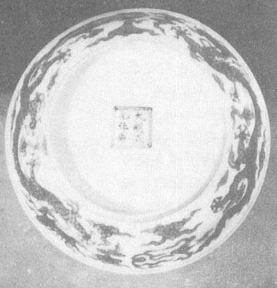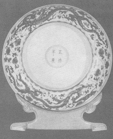 | 释义 | 明代的釉下彩绘瓷 (一)明早期 1.洪武时期的青花和釉里红瓷 朱元璋是明代第一个皇帝,建元“洪武”,在位32年(1368~1399年)。由于元末明初连年战争,百废待兴,制瓷业萧条,瓷器不多。 洪武时虽已设御窑厂,但目前没有发现带官窑款的瓷器。以前很多被视为元末或永乐、宣德时期的瓷器,自从南京明故宫玉带河遗址出土洪武瓷器碎片,才将其从元瓷或永乐、宣德瓷器中分离出来。从对典型器的对照排比中可知,洪武瓷既有元瓷的遗风,又有永乐、宣德瓷器的特点。 明故宫玉带河遗址中出土的瓷器有外酱釉、内钴蓝暗凸云龙纹大碗,还有外青花内模印凸起云龙纹盘。内心用青花绘三朵如意云纹,盘壁上内外模印、青花云龙纹饰正好重叠在一起,这正是元代枢府窑的装饰方法。纹饰内容、画法和元瓷相似,但比元瓷纹饰疏朗、明快。这两件瓷器虽然没有官窑款,但由于是明宫廷遗址出土,无疑应属洪武官窑产品。天津历史博物馆收藏了一件洪武晚期的青花云龙纹撇口盘,胎坚釉匀,底足有釉,足墙矮、外墙直、内墙略外撇,口内沿绘忍冬纹边饰一周,底心绘三朵拖尾云呈品字形排列,内壁有很浅的暗龙纹,外壁上下绘弦纹各一道,中间绘龙追绶带状云纹两组(图51),纹饰纤细,青花色闪灰。 通过仔细观察发现洪武瓷器的纹饰和元代纹饰还是有一些差别的,如这两个时期常见的缠枝菊,元代的菊花瓣是单层的而洪武时的则是双层的(图52、53);再如牡丹花,元代牡丹花瓣边缘呈串珠状,好似一排排晶亮的露珠,叶子或大而肥硕(彩版35),或像葫芦叶(俗称葫芦叶),洪武时的牡丹花瓣边缘则以留白显示瓣与瓣之间的层次而没有露珠(图54),叶子比元代的要小,画法娴熟简洁,像螺丝似的。做为边饰的仰莲瓣、覆莲瓣(一般在器物的底部或肩部),元代的基本是方角,瓣与瓣之间有缝隙,瓣中多画火纹、折枝花卉、垂云、八宝、杂宝等(彩版34、36),而洪武时的莲瓣是长圆形的没有楞角,瓣与瓣相连,没有缝隙(图52、53)。
