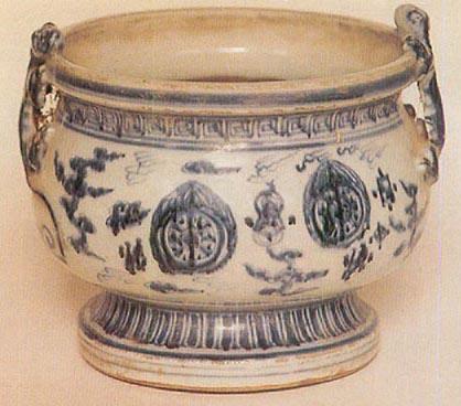 36.青花釉里红开光镂花盖罐 元 洪武瓷的胎体比元代的稍显轻薄,中部以下厚重,盘、碗的底足比元代的要大,大器足矮且宽,足里墙外斜,外墙里斜,底足无釉,细砂底。有的足底内心残留有乳钉状凸起,并有火石红或褐色斑、条,这是胎中含铁且淘洗不精细所致。施釉厚,釉面光润。青花颜色比起元代的浓艳稍显浅淡,略闪灰。常见器型有玉壶春瓶,盏托、碗、盘口环耳瓶、盘、大罐等。 洪武时期民窑青花瓷器比官窑的要多,纹饰风格和官窑青花相差不多,只是官窑瓷画得比较精细,而民窑瓷画得更随意更潇洒。无论官窑还是民窑的绘画技法,均为随意点染,没有轮廓。民窑碗、盘内心常见草书“福”字。碗外壁的纹饰多画在上半部,碗口边常绘稀疏的回纹。青花颜色有的青中泛黑,有的浅淡清新。底足有的无釉、砂底,有的刷薄厚不匀的浆白釉,大多数有鸡心凸起及自然形成或人工涂抹的火石红斑块。 这时期的釉里红瓷呈色不很鲜艳,绝大多数为紫灰色,纹饰类同于同时期的青花瓷,多为双层瓣的缠枝扁菊花、牡丹、云龙、松竹梅、海水、莲瓣等等。天津市艺术博物馆收藏了一件洪武时釉里红大罐,其纹饰为松、竹、梅、石等,非常少见(图53)。此时常见的器型有:盘、花口盘(图54)、盏托、碗、罐、玉壶春瓶、兽耳盘口瓶、梅瓶(图52)等等。 2.永乐时期的青花瓷 永乐(1403~1425年)、宣德时期的瓷器,是明代瓷器史上的第一个高峰。 据史书记载,从永乐三年到宣德六年,郑和七次出使西洋,带回了烧制青花的钴蓝料“苏麻离青”(有的史书记载为“苏泥勃青”)。这种钴蓝料含锰量低,在合适的火候中可以烧出浓艳的青色;但含铁量高,又会使青花中出现或大或小的黑色斑点,这种斑点下凹,沉入胎骨,迎光侧看闪银白色,俗称“锡光”,纹饰晕散不稳定。这些特点,成为永乐、宣德时期官窑青花瓷器中特有的风格。 永乐时期青花瓷器的胎土淘洗十分精细,没有什么杂质,因此胎子很白,胎薄体轻,釉子莹润肥厚如脂。青花瓷造型秀丽,无论是盘、碗等圆器还是瓶、罐等立器,均上薄下厚,有一种沉稳的感觉。撇口盘、碗口薄似刃,瓶、罐等基本看不出接痕,说明修胎规整。这时期还有一些新品种,如抱月瓶、天球瓶、八角烛台、漏斗、蒜头口绶带扁壶、竹节柄茶壶、轴头罐、花浇、僧帽壶(图55)、压手杯(彩版41)、无档尊、鱼篓尊(图56)、扁壶(图57)等。一部分器型具有西亚风格,说明那一时期中外文化交流非常普遍。其中,压手杯为永乐时所独有,而且数量不多,因此是最珍贵的品种之一。其胎厚重,造型小巧,秀美又稳重,放在手上大小适中,因而得名。