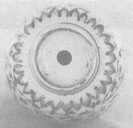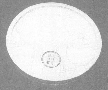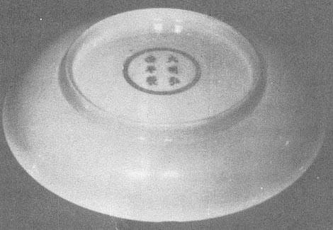 图79 正德青花阿拉伯文字器座 正德官窑器型较多,立器比较厚重,接胎痕迹明显。瓶、觚类瓷胫部外撇后下收,像加厚一块,而正德之前的瓶、觚类胫部只外撇不内收。碗、盘圈足稍高,直立或外撇、盘塌底。大件器增多,大罐、大葫芦瓶渐多且出现绣墩(图77),绣墩是坐器。从宋代的画上得知,当时已有藤编木制或漆制坐墩;据说元代时已有瓷坐墩了,但没见过实物和报道,所见最早的绣墩是正德的,万历较多。明代绣墩主要特点是:造型瘦高,上下瘦、中间肥、上下边各有一排稀疏的大鼓钉(绣墩本身就是仿鼓的形状制作的),坐面向上凸起,面、壁交汇处的折楞圆滑。 正德时期官窑款写得很工整,排列稍显松散,六字或四字款都有。正德的“德”字和宣德的“德”字一样,“心”字上没有一横,呈“德”状(图80、81)。