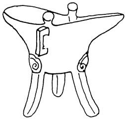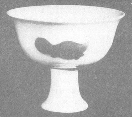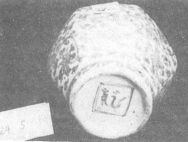 图84 嘉靖时的爵杯 嘉靖时期官窑款既有粗犷的,也有清秀的,但总的说写得比较规矩,“靖”字的边旁“立”一般都写在“青”字的上中部(图85)。有在器口横排写款的(如大缸、大罐、大瓶等),更多的则在器底双圈或双眶内写六字款。有的砂底器只在写款的部位罩釉。
