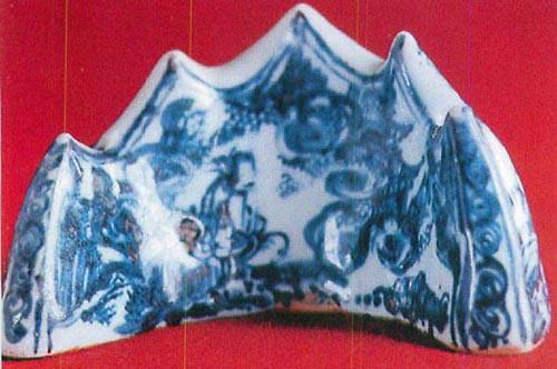 44.青花人物纹笔山 明·正统 景泰年间墓葬出土的青花瓷器种类稍多一些,如景泰四年严昇墓出土的长颈戟耳瓶、折腰碟、筒形香炉、净水碗、小盘以及景泰七年袁龙贞墓出土的碗、碟、戟耳方瓶、带座香炉等。从出土及传世品看,景泰年青花瓷胎子略粗厚,釉子浅鸭蛋青色或略闪灰,有的有开片,青花颜色深蓝,有褐色斑点。纹饰以折枝花、缠枝莲为多,也有卷云兰石、兰草、松竹梅灵芝,缠枝捧八宝、旋转状月华轮、结带四出金刚宝杵、人物、麒麟(彩版45)、梵文等,纹饰的随意性很强。