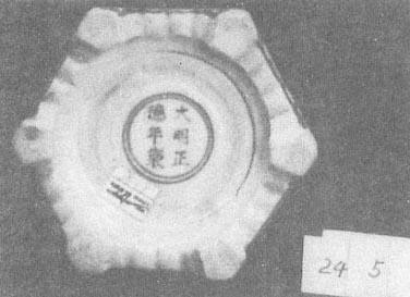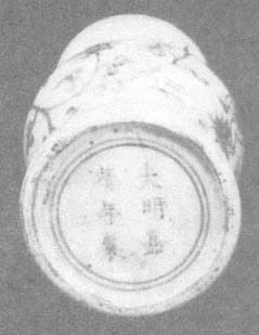 图73 弘治时期的款识 弘治时期的民窑青花瓷和成化时一样,无论胎、釉的质量,还是造型的秀气程度,在明代民窑瓷器中都是较为突出的。青花颜色比较浅淡。常见的纹饰有松鹤、折枝花、缠枝花、团花、花果、菜蔬、树石栏杆、高士图、婴戏仕女、骑马、鱼跃、庙前朝拜、火轮、莲瓣,纹饰画得非常潇洒飘逸,尤其人物,只寥寥几笔,活灵活现(彩版47)。常见器型除了盘、碗、香炉、大瓶、葫芦瓶外,还有一种深腹浅里的碗,俗称“诸葛碗”,即看外表是深腹碗,实际上碗很浅,底足心上有一大圆孔通腹部,腹是空的(图74、75)。相传三国时蜀国军师诸葛亮病重,吃不下饭,被敌国知道后派人前来证实,但来人看到诸葛亮一顿饭吃好几碗,赶紧回去禀报,实际上诸葛亮用的就是这种碗,对内安定了军心,对外又给敌人造成了错觉。其实三国时的窑址中根本没有出过这种造型的碗,传世品亦未发现,这种造型明代成化时才开始出现,弘治渐多,有人说是温碗,有人说是佛前供器。