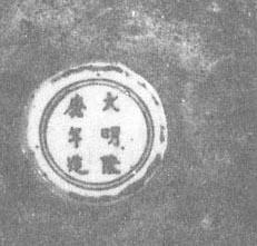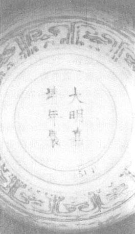 图81 正德时的款识 正德民窑青花瓷胎子坚致但不够细密,白中闪灰,有孔洞缝隙及黑点,釉子光润,白中闪青灰,多数是亮青釉,有的釉中有细密的气泡。青花颜色浅淡闪灰,具晕散、多双勾平涂,纹饰草率、随便,但不乏佳作。常见纹饰有缠枝荷莲、卷云纹、图案式小花、莲瓣、山石栏杆、凤穿花、婴戏、仕女、人物故事、鱼跃浪花、“壬”字云、梵文、花鸟、鹤鹿、田螺、方胜、钱纹、海涛等。撇口碗沿外折撇、幅度较大;盘底下塌,碗、盘圈足内收,修胎不规整,底足内釉色白,釉下隐约能看出放射状跳刀痕及小鸡心凸起和缩釉点。民窑款识常见“正德年造”、“大明年造”等,还有阿拉伯文款(图82)。