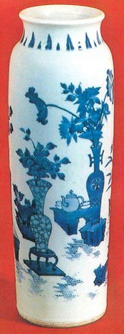 51.青花博古纹筒瓶 明·崇祯 崇祯时期主要器型有盘、碗、罐、花觚、香炉、净水碗、筒瓶(彩版51)等。多酱口,除部分盘、碗外,一般底足较高,足外墙下边无釉,底足内亦无釉。盘、碗有放射性跳刀痕,有的足根底下留有没旋削净的小台、窑渣、鸡心凸起及火石红斑块。筒瓶、花觚、罐等立器一般细砂底,有的能看出旋削后留下的弦纹。 崇祯青花瓷器带年款的较少,佛前供器多有长篇铭文,字体比较古拙。广东省博物馆收藏的那件香炉,底足有六字三行“大明崇祯年制”款,字体很小但有力、规整,青花颜色艳丽。崇祯时的斋堂款很多,往往写在碗心上,如“翔凤堂”、“于斯堂”、“博古斋”、“雨香斋”、“松石居”等,碗底常见“富贵佳器”、“雅”、“白玉”、“宣窑”、“片玉”以及银锭、方胜、兔子等图记款。 |