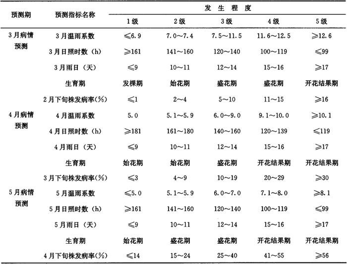 2 预测预报方法 2.1 病情趋势预报 早春主要根据苗期、定植后的发病率、寒流程度与次数、中长期天气预报的雨量与日照时数多少推测预报发生趋势。 2.2 短期防治预报 根据当前的发病率、病情指数、近期天气有无连续阴雨的情况,在雨前发布防治预报。 3 测报参考资料 3.1 病情指数分级标准 ◆0级:全株无病; ◆1级:全株有少数叶片发病,病叶占全株总叶片1/4以下; ◆2级:发病的病叶占全株总叶片1/4~1/2以下; ◆3级:发病的病叶占全株总叶片1/2~3/4,少数叶片出现枯黄现象; ◆4级:病叶占全株总叶片3/4以上,1/4叶片出现枯黄、枯死现象。 3.2 普查分级 大田病情巡回普查发生程度分级标准: ◆0级:无病; ◆1级:株发病率≤25%; ◆2级:株发病率25.1%~50%; ◆3级:株发病率50.1%~75%; ◆4级:株发病率≥75.1%。 3.3 防治适期 在番茄早、晚茬口的各主栽品种的叶霉病株发病率3%~5%的初始发生期为防治适期。 3.4 番茄叶霉病潜育期与温度的关系