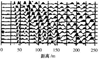 b陷落柱上的炮点记录 图4-21 炮点记录 (2)COP剖面(共偏移距剖面):从图4-22中不难看出,COP剖面上在0~130ms的记录段内,地震波形有明显的变化,形成一空白带,而这个空白带正对应着地下的陷落柱。