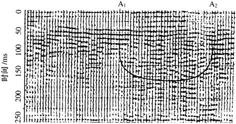 图4-23 SS11线地震参数曲线(第11道) (4)CDP叠加剖面:图4-24中,0~75ms范围内地震波同相轴连续性较好。75ms以下,A1A2段的波形表现为振幅强,但很零乱,类似于破碎带上的显示,与其周围的波形显示截然不同。