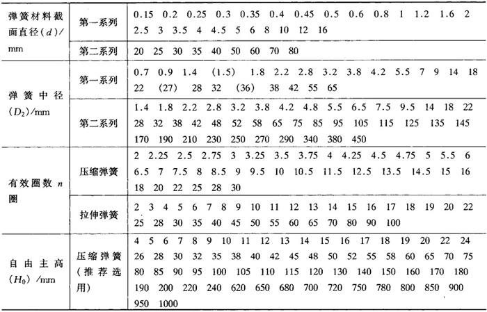 注 ①上表适用于压缩、拉伸和扭转的圆截面螺旋弹簧;②应优先采用第一系列,括号内的只限于老产品;③拉伸弹簧有效圈数除按表规定外,由于钩环相对位置不同,其尾数还可为0.25、0.5、0.75。 |