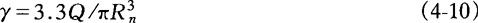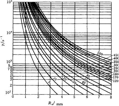 式中 γ——熔体在流道中的剪切速率(s-1) Q——熔体在流道中的体积流率(cm3/s) Rn——浇注系统断面当量半径(cm) 根据此函数关系绘制出γ-Q-Rn曲线图,如图4-28所示。该图使用方法是由γ轴出发水平向右,与已知的某一体积流率Q的曲线相交,再由交点向下作垂线,得到Rn轴上的数值,即为所求的浇注系统的断面当量半径。