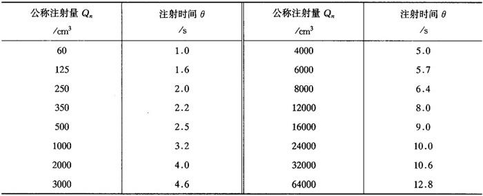 图4-28 γ-Q-Rn关系曲线图 (1)确定适当的剪切速率γ 浇注系统中各段的γ值如下: ①对于主流道γ=5×103s-1; ②对于分流道γR=5×102s-1; ③对于点浇口yG=105s-1; ④其它形式浇口γG=5×103s-1~5×104s-1。 (2)确定体积流率Q 浇注系统中各段的Q值是不相同的。 ①主流道的Qs:根据模具成型塑件的体积和所用注射机的技术规格,由下式计算: Qs=Qp/θ (4-11) 式中 Qs——主流道的体积流率(cm3/s) θ——注射时间,由表4-6选取 Qp——模具成型塑件的体积,通常取Qp=(0.5~0.8)Qn Qn——注射机的公称注射量(cm3) 表4-6 注射机公称注射量Qn与注射时间θ的关系