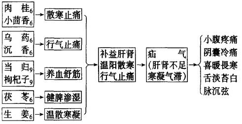 【要点】 睾丸为宗筋汇聚之所,诸疾多从肝论治,本方温、行、补兼施,药物以归肝经为主。 【应用】 1.睾丸或小腹冷痛。 2.精索静脉曲张。 3.腹股沟疝。 4.睾丸鞘膜积液。 【注意】 本方适用于肝肾虚寒,气机阻滞之少腹疼痛,疝气疼痛。若证属实热,见阴囊红肿热痛者,切勿使用。 【类方】 天台乌药散(《医学发明》):由乌药、木香、茴香、青皮、高良姜、槟榔、川楝子、巴豆组成。功能行气疏肝,散寒止痛。主治寒凝气滞的小肠疝气,少腹痛引睾丸,舌淡苔白,脉沉迟或弦。天台乌药温散力强,适用于寒凝气滞较重的疝气腹痛;而暖肝煎温散之中兼具补性,主治肝肾亏虚而寒凝气滞之疝气腹痛。 |