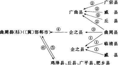 ①1912年称曲周县;1940年3月析曲周县、临清县、威县3县临近地建立企之县,1945年撤销。②1940年6月于曲周至丘县公路以北及广宗县、威县、丘县各一部分建广曲县,1945年撤销。③1946年10月,为纪念抗日县长郭企之烈士,曲周县改称企之县。④1949年企之县更名为曲周县。⑤1958年先后将鸡泽县、丘县、广平县、肥乡县并入曲周县。⑥1961~1962年又分别恢复曲周县、鸡泽县、丘县(1996年经国务院批准,丘县更名为邱县)、广平县,肥乡县原建制。