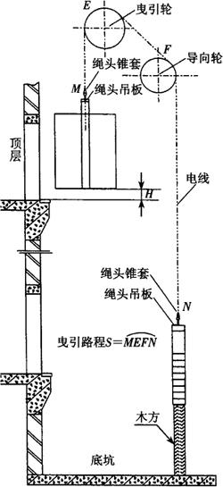 首先测量轿厢和对重曳引绳头之间的曳引行程S,测量方法是:使用一条电线穿过主机的曳引轮和导向轮,电线的一端与轿厢侧曳引绳头杆顶点M重合,另一端与对重侧曳引绳头杆顶点N重合,该电线的长度即为曳引行程S。