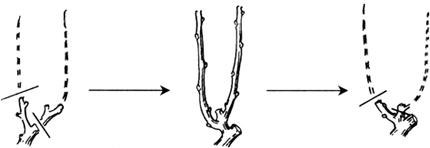 图25 单枝更新 (2)双枝更新 冬季修剪时在每个结果母枝上都留2个靠近老蔓的充分成熟的1年生枝,上面一个适当长留,作来年的结果母枝,下面一个短留用做预备枝。下年冬剪时将上部结果部位疏除,从下部预备枝上所抽生的枝梢中选近基部的2个枝梢,其中上面1枝做下一年的结果母枝长留,下1枝做预备枝短留,每年均照此法修剪(图26)。