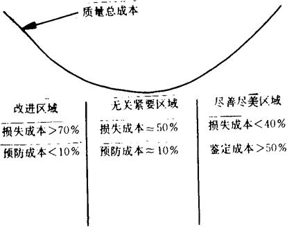 图13-15 当损失成本>70%时,处在质量成本改进区域,企业必须找出质量改进项目,降低不合格品率。当损失成本≈50%,预防成本≈10%时,处于无关紧要区,此时质量成本在最佳区域内,如没盈利项目可开发,质量成本管理重点在于控制。当损失成本<40%,鉴别成本>50%时,处在尽善尽美区,企业可根据顾客和市场的要求,适当放宽标准或减少检验,保持适宜的质量成本费用投入(见图13-16)。