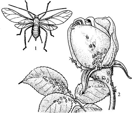 【分布和为害】 分布华东、华中、东北地区。寄主有月季、蔷薇等。为害花蕾、新梢、嫩叶,刺吸其汁液,造成枝梢生长缓慢,花形变小。此外,还因蚜虫的分泌物,诱发煤污病(图5-26)。