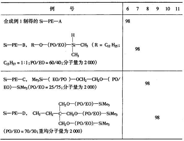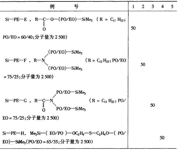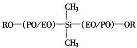 | 释义 | 有机硅纺织油剂 本油剂可用于涤纶、尼龙、丙纶、腈纶和醋酸纤维等,使纤维具有优良的平滑性和抗焦油化等性能。 历来使用的油剂有矿物油和脂肪酸酯等,如聚氧化烯烃醚类、聚氧化烯烃醚和脂肪酸及其酯、聚氧化烯烃的缩甲醛化物、聚氧化烯烃化双酚和脂肪酸及其酯、原硅酸酯或聚醚改性的硅酮等。 但矿物油和脂肪酸酯类易焦油化,聚氧化烯烃类和双酚与脂肪酸及其酯的平滑性较差,聚氧化烯烃醚和脂肪酸及其酯与缩甲醛化物对纤维中的橡胶质有膨润作用,而甲醛化物收率较低,甲醛化剂难以除去。 本品是在前述油剂上作了改良,以下举例说明。 合成例1 有机硅聚醚Si-PE-A的合成 R-O-(PO/EO)-SiMe3500g(0.25ml)(式中,R=C4H9;PO=氧化丙烯;EO二氧化乙烯;PO/EO=50/50重量比;EO/PO为无规聚合; 用质子核磁共振分析得反应率(聚醚的-OH基与三甲基硅烷基的转化率)约80%。 合成例2 Si-PE-I的合成
