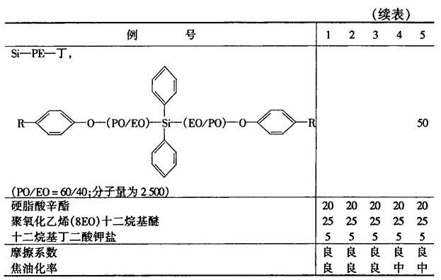 例1~5 按表1所列的配方,制成10%的乳胶油剂,对以硅氧烷脱脂干燥的尼龙长丝给油,油剂附着量为0.8%~1.0%。这些产品与传统的纺织油剂比较,摩擦系数低、焦油化率也低。 表1 乳胶油剂的配方(份)与性能