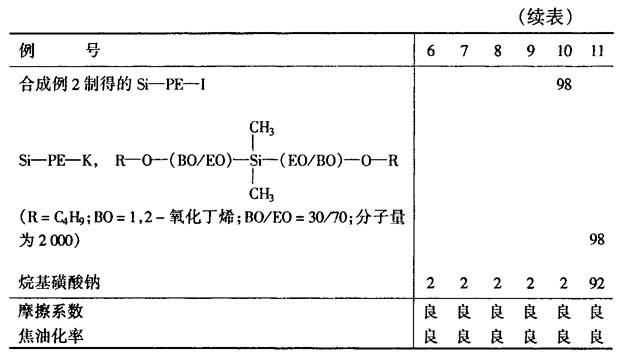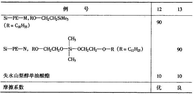 例18~19 用与上述同样的方法制造聚酯POY纤维,以下列配方为油剂,效果同样良好。 Si-PE-K(见表2) 45% 棕榈酸异辛酯 10% C12H25O(C3H6O)2O(C2H4O)18嵌段共聚物 40% 烷基磺酸钠 5% 将所得的POY用常法拉伸搓捻,卷取,添加下述配方油剂,附着量为1.5%~2.0%,效果同样良好,可供织布用。 Si-PE-A(见表4) 60% 矿物油(雷德伍德粘度为60s) 30% 失水山梨醇单油酸酯 5% 聚氧化乙烯(5EO)壬酚醚 4% 10×10-6m2/s(30℃)二甲基硅酮油 1% (日本特许公开:3-14945) |