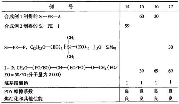 例14~17 按表1所列的配方制成油剂,用于制造POY(部分定向丝),其摩擦系数低,丝的质量良好。 POY的制造 聚对苯二甲酸乙二酯熔融纺丝后,立即使用10%乳胶作油剂给油,以3500m/min的速度卷取,得115袋36POY长丝12kg,油剂附着量为0.4%~0.5%。 表4 油剂的配方(份)和性能