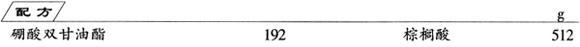 制法 硼酸双甘油酯加上棕榈酸,加热到200~210℃进行酯化反应,脱水36g后(约5h),得黄色蜡状产品,酸值为82mgKOH/g(理论值为84mgKOH/g)。二者经酯化反应后,生成油溶性有机硼表面活性剂。 |