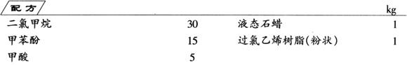 先将过氯乙烯树脂加入二氯甲烷中,待充分溶解后再加入其他三种原料混合均匀,密封,即成产品。使用时,将工件放入脱胶剂中,盖上盖,便可脱胶。
