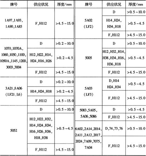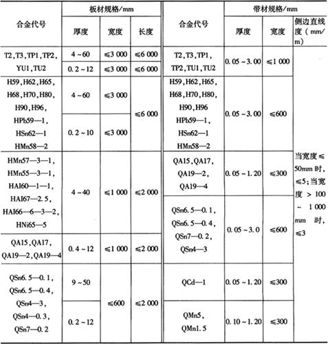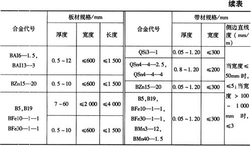 注:①本标准适用与一般用途的铝合金及铝合金冷轧带材,不适用于深冲涂漆及PS版基材等特殊要求的铝及铝合金冷轧带材。 ②带材的化学成分应符合GB/T3190相应合金牌号的规定。 ③用来制作食品器皿的带材应在合同中注明“食用”字样,Pb、Cd、As每个元素含量(W)不得超过0.01%。 (二)铜及铜合金 1.加工铜及铜合金板材及带材的规格 加工铜及铜合金板材及带材的规格如表2-67所示。 表2-67 加工铜及铜合金板材及带材的规格(摘自GB/T17793-1999)