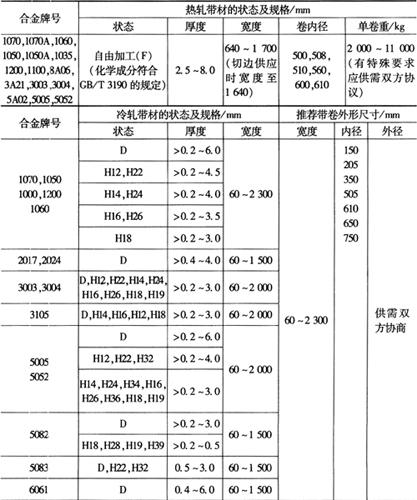 2.铝及铝合金轧制带材 铝及铝合金轧制带材尺寸及厚度允许误差如表2-66所示。 表2-66 铝及铝合金轧制带材的牌号及规格(摘自GB/T1650-1996)