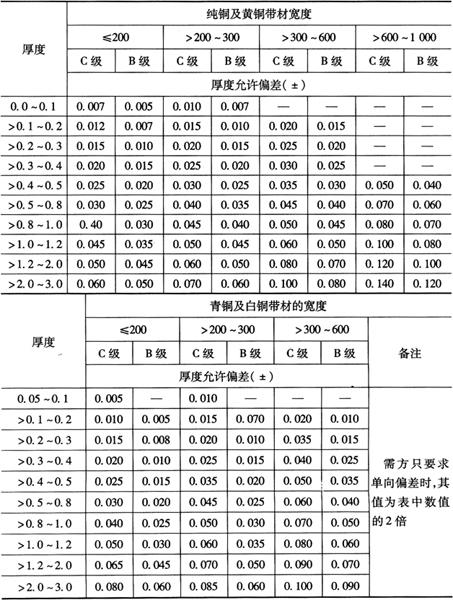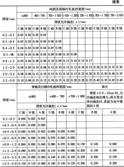 注:厚度>15mm时的热轧板,可不切头交货。 3.加工铜及铜合金带材厚度及宽度允许偏差 加工铜及铜合金带材厚度及宽度允许偏差如表2-70所示。 表2-70 加工铜及铜合金带材厚度及宽度允许偏差(摘自GB/T17793-1999)(mm)