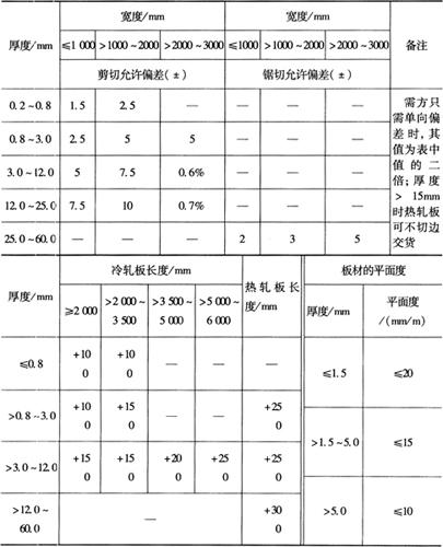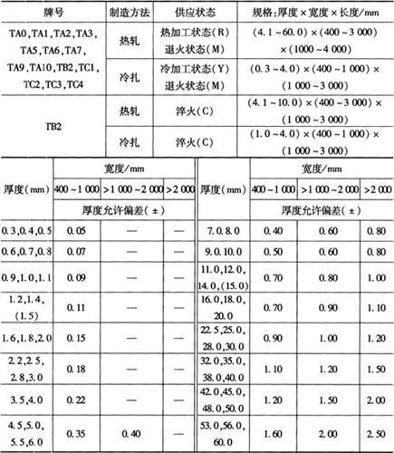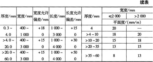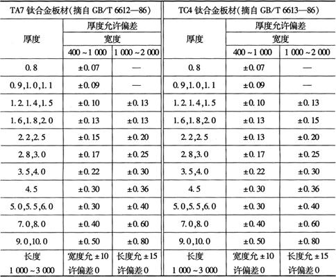 注:括号内数为不推荐值;厚度大于15mm的板材,需方同意时也可以不切边交货。 2.重要用途的TC4和TA7钛金板材的尺寸偏差 重要用途的TC4和TA7钛金板材的尺寸偏差如表2-72所示。 表2-72 重要用途TA7和TC4钛合金板材的尺寸允许偏差(mm)