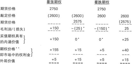 | 释义 | 期权权利金的组成成分和影响因素 当市场价格相对敲定价格产生变化时,期权的价值就会发生变化。在宣布日之前,期权的权利金: ·可能含有内涵价值…… ·可能含有内涵价值和外延价值…… ·仅具有外延价值。 简而言之,这些所谓的价值包括: ·内涵的:指由敲定价格和当前标的资产的市场价格间的差额所产生的利润; ·外延的:超出内涵价值的那部分权利金,它是事实和假设两种因素的综合,具体包括: ——时间价值; ——利息率; ——供需关系; ——市场价格的变动参数。 9.6.1 内涵价值 为了确定是否具有内涵价值,必须首先确定执行期权是否可以获利。 如果可以获利,期权就具有内涵价值。 内涵价值是: ·一项期权到期时的价值…… ·当实值期权同标的期货的价值相比较时,期权所超出的价值量…… ·假设期权在当天执行,所获得的毛利润(也就是说在扣除权利金成本之前)。 在到期日,实值期权的价值全是内涵价值,而在此之前,期权拥有内涵价值的条件是: ·对于看涨期权,期货价格高于敲定价格; ·对于看跌期权,期货价格低于敲定价格。 9.6.2 外延的或选择性价值 期权拥有的外延价值或选择性价值,是指其权利金超出内涵价值的那部分价格。超出权利金的价格中相当大一部分是由时间价值构成的,剩余的部分由包括变化参数、利息率、供需以及扭曲等因素产生。 实值期权具有内涵价值。而如果权利金超过内涵价值,则超出部分就是外延价值。 虚值期权不具有内涵价值。如果它距离到期日仍有一段时间,则会拥有一些外延价值,即使这些外延价值可能是微乎其微的。 当敲定价格与市场价格相同或非常接近时,期权的外延价值最大。 9.6.3 内涵价值与外延价值的示例 当对期权估价时,应注意区分下列价格和价值之间的关系: ·敲定价格; ·期货价格; ·期权价格:权利金; ·内涵价值:实值期权在敲定价格和期货价格之间的那部分毛利润; ·外延价值:权利金超出内涵价值的部分; ·时间价值:外涵价值的组成部分(详见第9.6.5节)。 当计算一项期权的价值时,如果计算结果显示内涵价值是负的(如下例中标有*的数字),就要以零计算。因此,市场中的任何权利金交易的实际上都只是外延价值的交易。 例