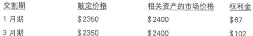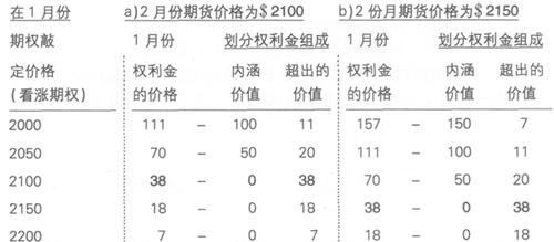 (* *:应注意期权权利金在很大程度上受到波动性和时间价值(详见第9.6.5节)这两个外延价值中重要因素的影响) 一项期权获利的可能性并不总能轻易被定义为执行时是否产生毛利润/毛损失,某些虚值期权也会具有赢利性。如果在市场变化不大的一段时间中购入期权,随后,金属价格中的变化因素增加,那么权利金将会反映由高变化性所引起的额外的外延价值。同样,当外延价值降低时,期权当前的价值同其最初的权利金相比,就会下降,也就不具盈利性了。例如,如果在变化很强烈时(比如50%),购进了虚值期权,接着变化迅速减弱(比如到20%),则该期权外延价值将会降低,而且会以更低的权利金价值形式反映出来。 9.6.4 举例说明市场价格与期权价值的相关性 当期货价格相对敲定价格发生变动时,外延价值和内涵价值会发生变化。权利金中外延价值最大的是评估期权。 例 在1月份时,交割期为2月的不同期货的价格