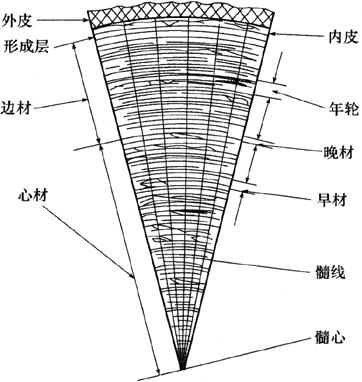 | 释义 | 木材的构造 由于树种和生成环境不同,各种木材在构造上也有很大差异。木材的构造是决定木材性质的主要因素,木材的构造一般从宏观构造和微观构造两方面进行研究。 (一)木材的宏观构造 木材的宏观构造用肉眼和放大镜进行观察和分析。由木材的横向、径向和弦向三个切面可知,木材是由树皮、形成层、木质部、年轮、髓心等部分组成。有的木材还可以看到放射状的髓线。其宏观构造如图9-1所示。