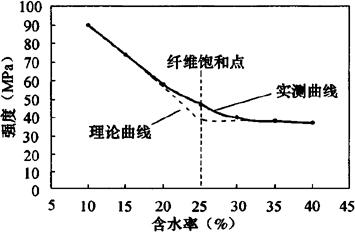 式中 γ0(W)——表示木材含水率为W%时的表观密度(kg/m3); G(W)——含水率为W%时木材的质量(kg); V0(W)——含水率为W%时木材的体积(m3)。 由以上公式可以看出,木材的表观密度与含水率密切有关,为了使木材具有可比性,通常规定木材的含水率15%时为标准含水率。另外,木材中晚材含量多的,其表观密度相应较大;阔叶树种比针叶树种木材的表观密度大。 (二)木材的含水量 木材的含水量是影响木材物理和力学性质的一个重要指标,一般常用含水率表示,即木材中所含水的质量占干燥木材质量的百分数。 1.木材中水的种类 木材中所含的水分,可以分为自由水、吸附水和化合水三种。自由水是存在于细胞腹腔内和细胞间隙间的水分,自由水主要影响木材的表观密度、保存性、抗腐蚀性和燃烧性;吸附水是存在于细胞壁微纤维丝之间的水分,由于细胞壁具有较强的亲水性,且能吸附和渗透水分,所以水分进入木材后首先被吸入细胞壁,吸附水是影响木材强度和胀缩的主要因素;化合水是与细胞壁组成物质化学结合的水分,一般不影响木材的性质。 新采伐的木材称为生材,其内部都含有大量的自由水和吸附水,含水率一般在70%~140%。当木材在干燥时,首先是自由水很快被蒸发,但并不影响木材的尺寸变化和力学性质。当自由水完全蒸发后,吸附水才开始蒸发,但蒸发的速度较慢,而且随着吸附水不断蒸发,木材的体积和强度均发生变化。化合水需在150~180℃以上才会发生破坏,且所含数量很少,研究物理力学性质时,可以不考虑化合水的变化。 2.纤维饱和点 湿木材放置在空气中干燥,其水分将随着环境的温度和湿度的变化而变化,当木材中没有自由水,而细胞壁内充满吸附水,达到饱和状态时,称为木材的纤维饱和点。纤维饱和点等于木材吸附水的最大量,是木材含水量中最重要的物理量。 纤维饱和点是木材含水率是否影响其强度和湿胀干缩的临界值,这是木材物理力学性质的转折点、分界线。木材的纤维饱和点的大小,随树种而异,一般为23%~33%,通常以30%作为各树种纤维饱和点含水率的平均值。 纤维饱和点含水率的重要意义不在于其数值的大小,而在于它是木材许多性质在含水率影响下开始发生变化的起点。在纤维饱和点之上,木材含水量变化是自由水含量的变化,它对木材强度和体积的影响甚微;在纤维饱和点之下,木材含水量变化是吸附水含量的变化,将对木材的强度和体积等产生较大的影响,如图9-2所示。