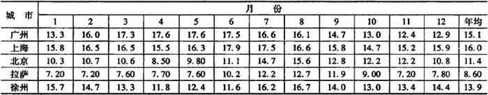 图9-3 木材的平衡含水率 为了避免木材因含水率大幅度变化而引起过大变形及木制品开裂,木材在使用之前,必须干燥至使用环境下平均平衡含水率,然后再进行加工。在不同地区使用的木材,要求其平衡含水率也不相同。如我国的新疆、内蒙古、甘肃等地区的木材平衡含水率为8%~10%,北方其他地区木材平衡含水率为12%~14%,南方地区木材平衡含水率为15%~17%。我国部分城市木材的平衡含水率如表9-1所示。 表9-1 我国部分城市木材的平衡含水率