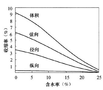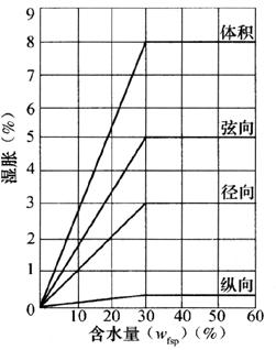 (三)木材的湿胀干缩变形 木材细胞壁内吸附水的变化会引起木材发生变形,这就是木材另一个物理性质——湿胀干缩变形。木材从潮湿状态干燥到纤维饱和点的过程中,木材尺寸形状不会发生变化,只是质量有所降低。当木材从纤维饱和点干燥至细胞壁中的吸附水开始蒸发时,木材才会发生收缩。当木材中的吸附水增加时,木材的体积也会增大。 木材的湿胀干缩变形,理论上数值相等,仅方向相反。但实际上因吸收滞后作用,干缩率一般大于湿胀率。由于木材的构造具有不均匀性,所以在不同方向的干缩值不同,一般新伐木材完全干燥时,顺纹方向干缩最小(0.1%~0.3%),径向干缩较大(3%~6%),弦向干缩最大(6%~12%),体积收缩9%~14%。 细胞壁基体在失水收缩时,纤维素束沿细胞轴向排列限制了在该方向的收缩,且细胞多数沿树干纵向排列,所以木材主要表现为横向收缩。由于复杂的构造原因,木材弦向收缩总是大于径向,弦向收缩与径向收缩比率通常为2∶1。干缩对木材的使用有很大影响,它会使木材产生裂缝或翘曲变形,以致引起木结构的接合松弛或凸起等。 图9-4是新伐木材的干燥曲线示意图,图9-5为以松木为例表示含水率与湿胀率的关系,图9-6为木材在干燥后其断面尺寸和形状变化,图9-7为木材不均匀干缩板材发生的几种翘曲和扭弯。