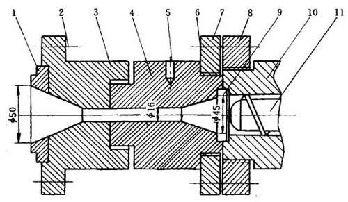 图10-2 无分流梭棒材机头的结构示意图 1-口模 2-与冷却模连接螺钉 3-机头扩大部分 4-机头收缩部分 5-温度计插孔 6一与机头连接螺钉 7-机头法兰 8-机筒法兰 9-过滤板 10-料筒 11-螺杆 图10-3有分流梭棒材机头的结构图。这种机头的特点是:在流道中心设有一个分流梭2,其作用在于减少流道内部容积,并增大塑料熔体的受热面积,有利于停车后重新开车时缩短加热时间,可防止熔料降解。平直部分的口模应光滑,并有一定的长度,有利于棒材外观质量的提高。